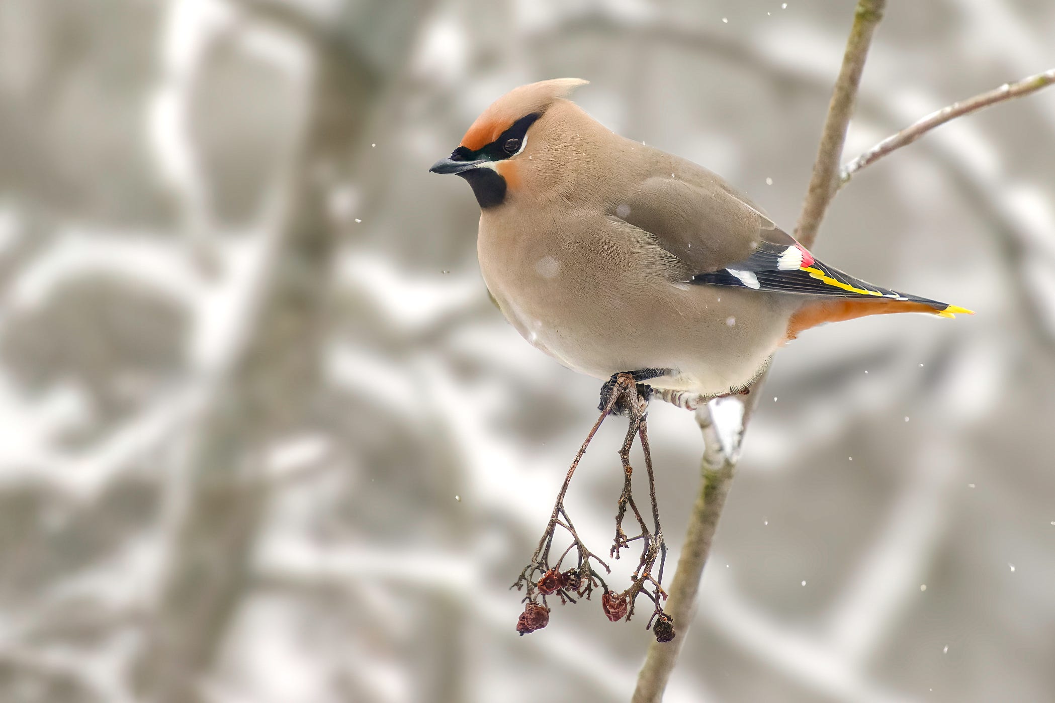 Well, if you were to nestle a Bohemian Waxwing in your palm, it would feel sincere and above all silky smooth. Were it to shift in your hand, similar to the way it carries itself in the world, the waxwing would be tame and docile, but moving with purpose and dignity. The wispy crest atop its head might caress your fingertips. From there, the silky feeling along your fingers would be broken by a lattice of bright white and loud yellow wing markings. You’d also feel a row of little bumps — the red, waxy droplets that give waxwings their name. Below its belly, basically at the waxwing’s “privates,” is a fluffy patch of sweet cinnamon feathers. And finally, that straight edge on your wrist would be the tail edge, marked as if dipped in screaming yellow paint.