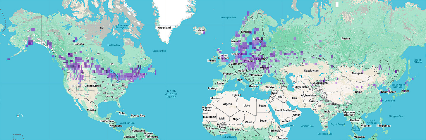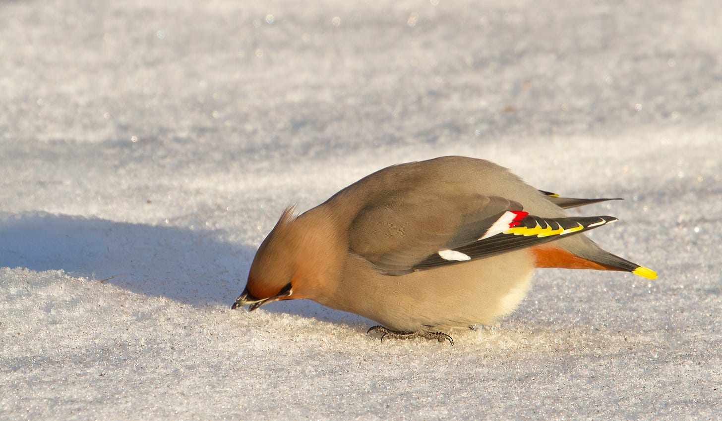 At the end of this post is a rough map of Bohemian Waxwing sightings so far in 2026. If you’re near or in that purple zone, I’ve got insider advice and clickable maps so that you might discover this attractive songbird on your own. Find that perk and more at our Go Wild portal’s Sightings page, another expression of gratitude for your paid subscription.